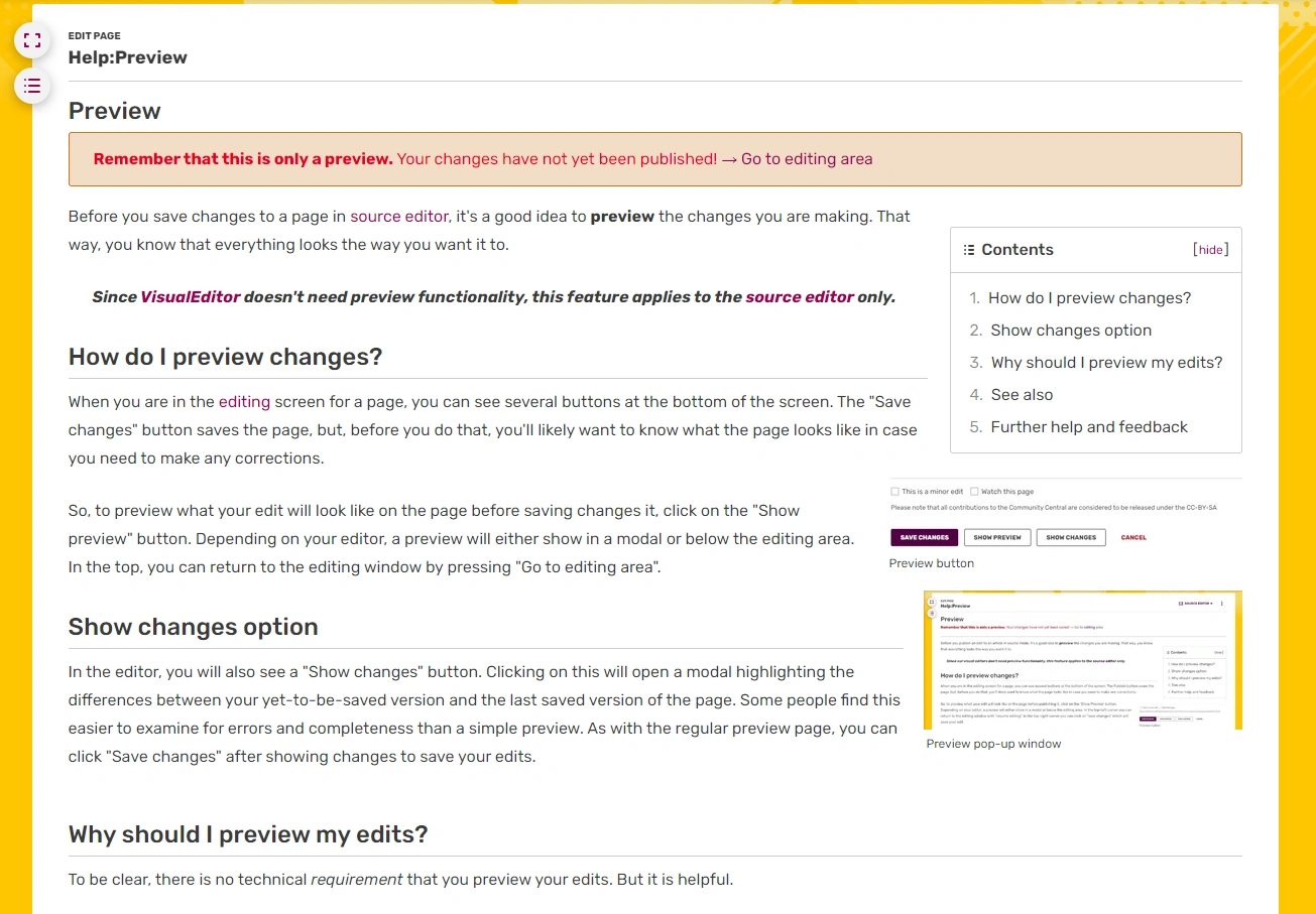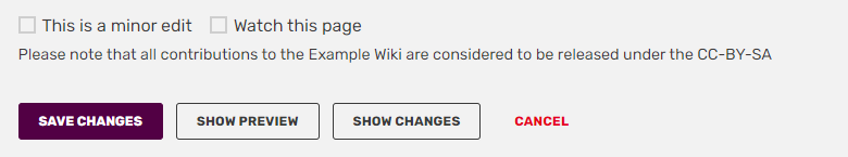 In the editor, you will also see a "Show changes" button. Clicking on this will open a modal highlighting the differences between your yet-to-be-saved version and the last saved version of the page. Some people find this easier to examine for errors and completeness than a simple preview. As with the regular preview page, you can click "Save changes" after showing changes to save your edits.