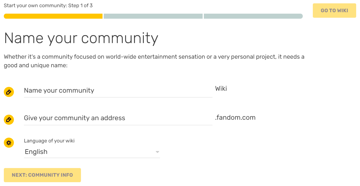 Any logged-in user can create a community (known as a "wiki") on Fandom at any time through the creation form. Below we walk through what to do and how to go about creating a community.