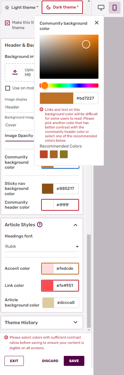 When the community background color and community header color do not have sufficient color contrast, they can make the local nav unreadable. If there are issues with the contrast here, the error message will read, "Links and text on this (background) color will be difficult for some users to read. Please pick another color that has better contrast with the community header color/community background color or select one of the recommended colors below."
