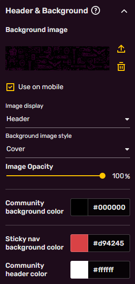 - Image opacity sets how see-through the background image is against the background color. The lower the percentage, the more transparent the image becomes, which is useful to allow for better contrast of elements. Alternatively, you can adjust the community header text color to achieve this.