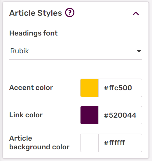 - Article styles: Define the colors for the article background and links, plus choose a font for headings.