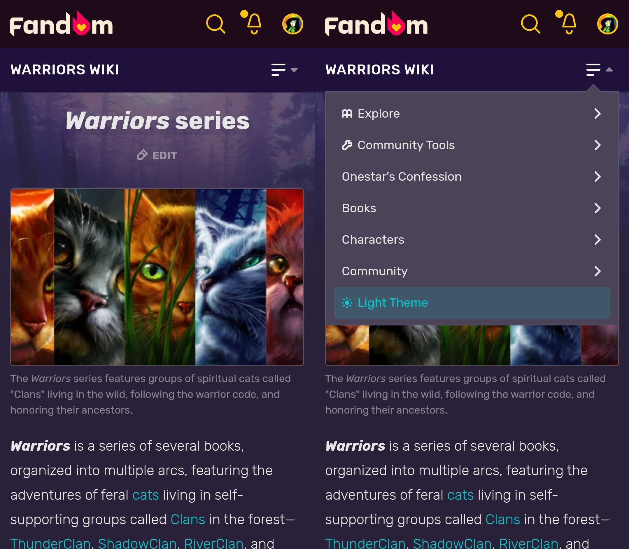The Theme Designer is an easy-to-use admin tool that allows you to quickly customize your wiki's theme, header, and logo. You can choose from a pre-set theme when creating your wiki for the first time, or design your own unique theme that fits your community's topic for both light and dark theme.