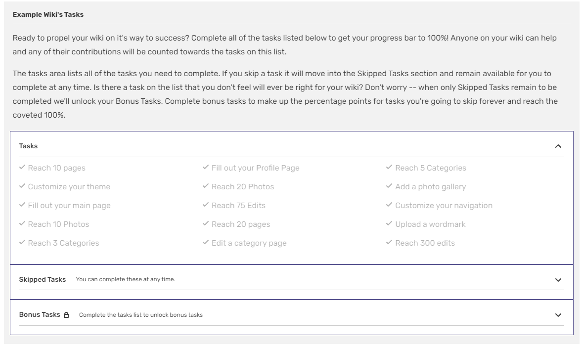 The Wiki Progress Bar is a tool available in the Admin Dashboard for founders and admins that leads them through the first days and weeks of creating a community. There are specific tasks that give users suggestions on how to get their community off the ground. When all 27 tasks are completed, the percentage indicator reaches 100%.