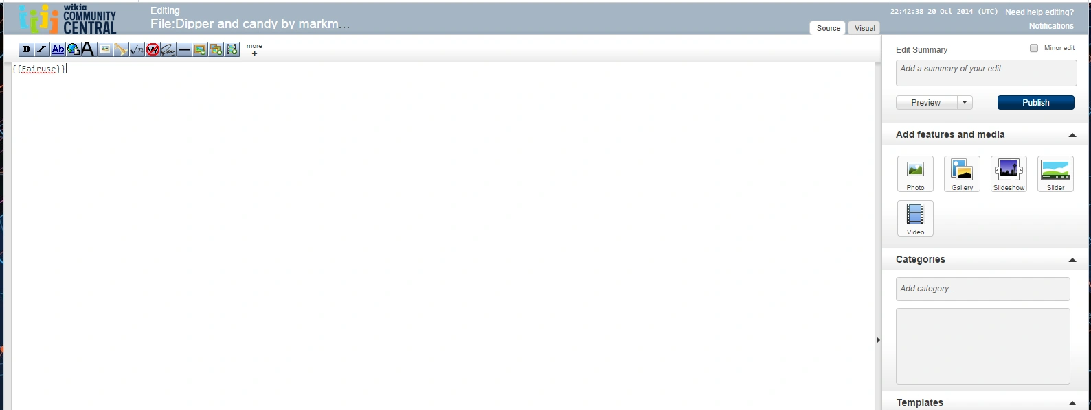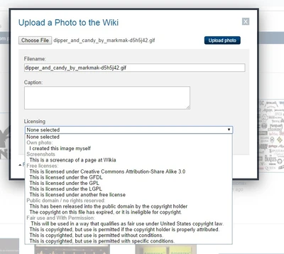 But what if I forgot to license in the uploading process? Well that's alright, you can license at anytime. Just go to the files page, example :http://community.wikia.com/wiki/File:Dipper_and_candy_by_markmak-d5h5j42.gif, and click "Edit". You'll want to head to the "Source Mode" editor. Then just insert the license like a regular template, example {({fairuse})}. The last step in that process is to publish it, by clicking "Publish".