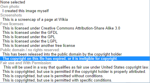 Like I said earlier, licensing helps users identify where the picture came from. Common sense should tell you (I don't have much of that, so emphasis on should), that there are a lot of different license, since all images don't come from the same source. You can choose any of them, I'll list them. The main license is {({FairUse})}, and the one that you'll likely use.