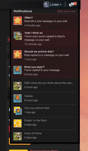 Wiki notifications appear in a new menu. You’ll be notified at the top-right of your wiki (next to your user menu) for new messages on your wall, as well as for replies to any conversations you’re following. These notifications will automatically mark themselves as read when you view the conversation.