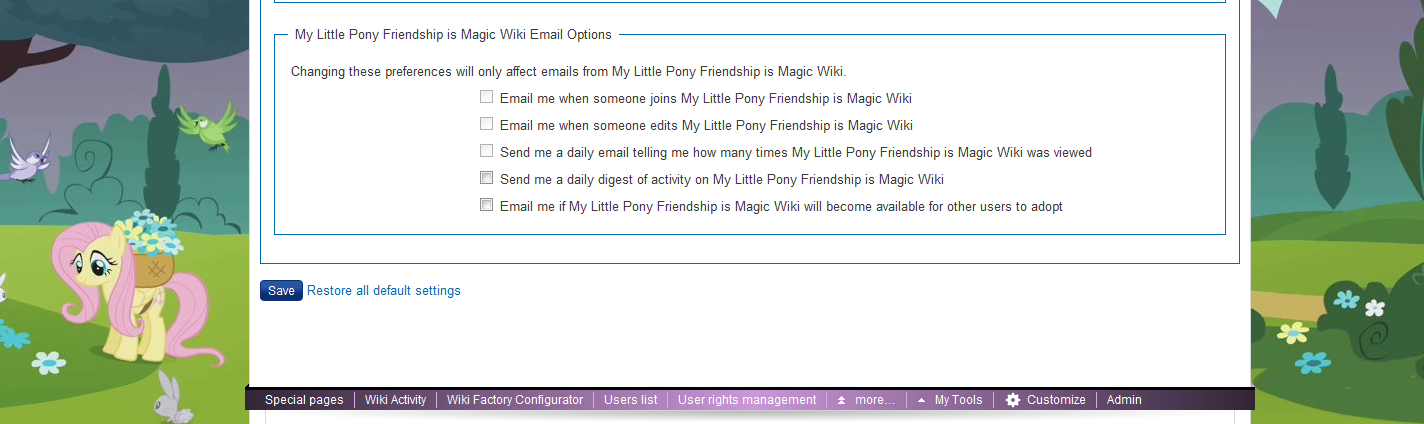 Remember these are local preferences, so you'll have to go to each wiki you admin and edit your preferences. This way, if you have more activity on one wiki than another, you can adjust your email influx to fit those needs.