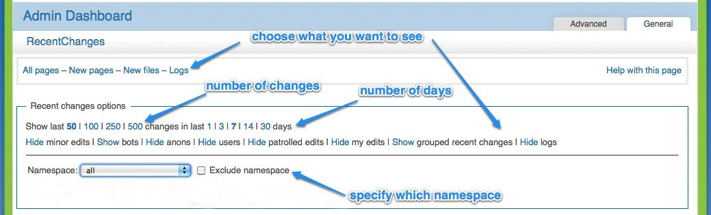 At the top of Special:Recent Changes, you will see two boxes full of options, many options. They each offer ways to drill down to specific actions and happenings around a wiki. You can filter to: All Pages, New Pages, New files or Logs. And/or choose as little as seeing 50 changes or as many as 500, along with how many days of changes. You can also narrow done and filter your search by hiding minor edits , anons, users, patrolled edits, your own edits and logs. You can specify to show bots and group changes together as well. Each of these options gives you either a larger view or a more narrowed, closer look at the activity happening on the wiki.