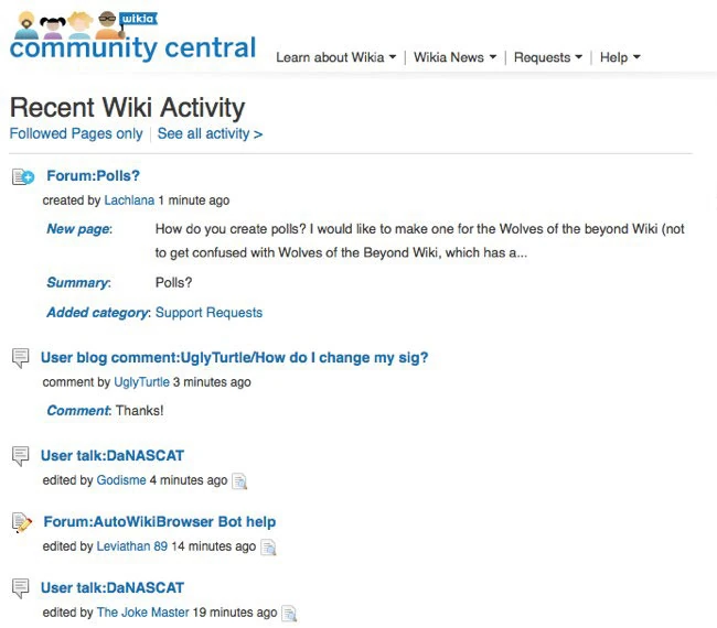 Wikis by nature have a lot of activity on them. Once a wiki starts to attract a community -- whether that's two or three people or hundreds of people -- a lot of action can happen over any period of time. Editing, uploading an image, writing a blog post, leaving a comment, adding a new page, asking a question in a forum -- so much can happen! Because anyone can come and edit (and add any of the above contributions and more) it’s useful to be able to find all of that activity in one place.
