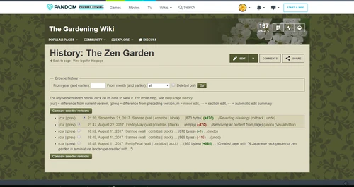 | “ | Tip: Experiment with the radio buttons on history pages, to see how you can compare several changes at once. This is useful when someone has done a series of edits and you want to see the full effect. | ” |