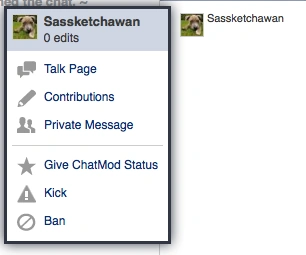 - Ban now works like block - Admins and chatmods can set time limits and list a reason for banning a user from chat. All bans are recorded at Special:Log/chatban and are displayed on the banned user's contributions and masthead. Bans can also be controlled directly from the log or contributions page as well.