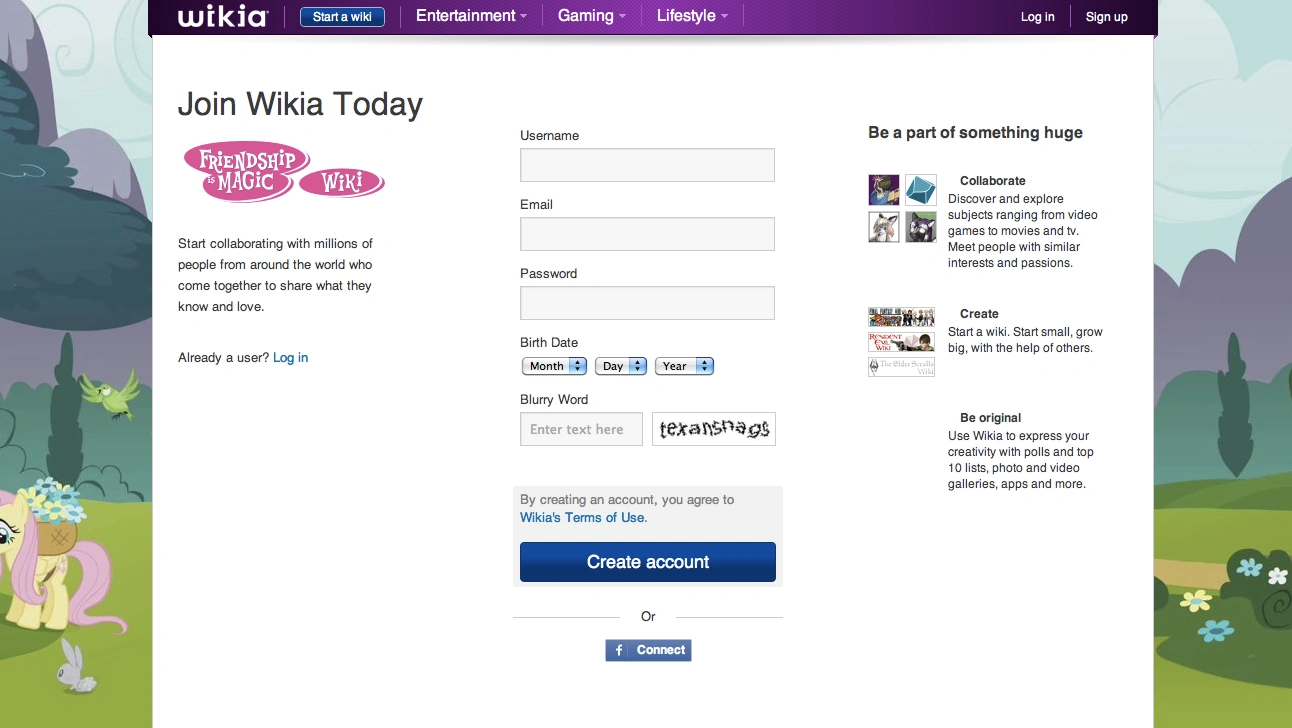 We've also made Facebook Connect the most efficient and easiest way to sign up. Because Facebook already requires you to confirm your email address for their site, that's one less step you'll have to do on Wikia.