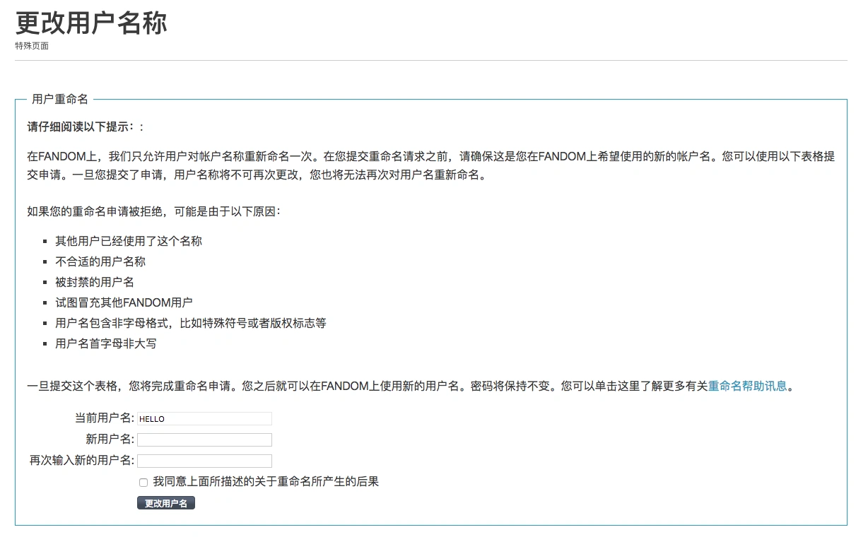 今天, 我们将给用户添加一项新的工具允许用户自行变更用户名。它就是“用户重命名工具”!FANDOM从2010年开始就允许用户对用户命进行变更,但是这需要提交请求之后通过工作人员的审核才能达到。而从现在开始,用户就可以自己使用“Special:UserRenameTool”填写表单然后重命名自己的帐户了。