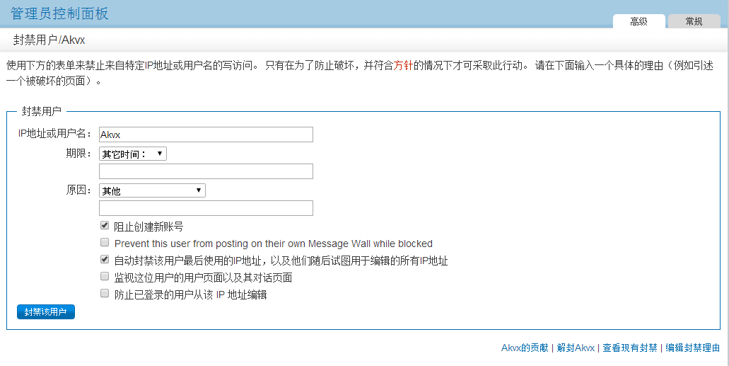 - 不論是IP用戶或是登入用戶,你都可以在最近更改、用戶貢獻或在Special:Blockip中點擊「封禁」