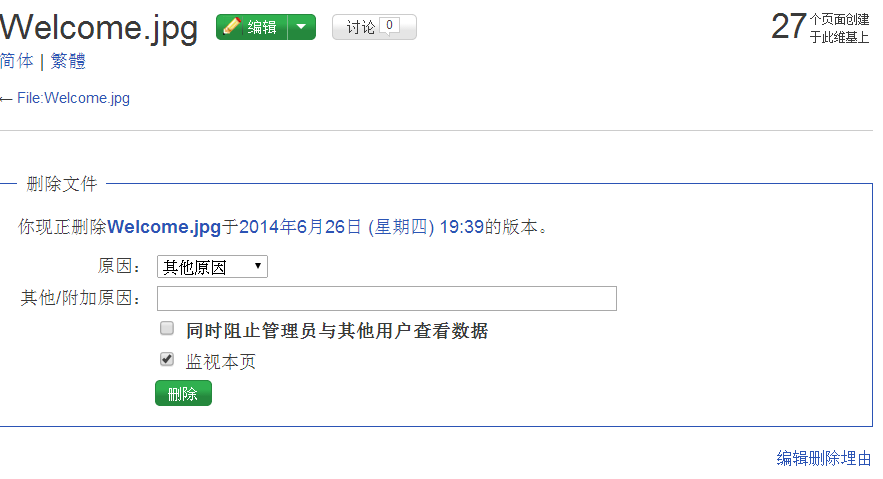 - 你會看到一個頁面有一個刪除「原因」的選單,也可以在格子中輸入其他刪除原因。也有一個可選擇監視該頁面的選項(如果有人再度建立該頁面時可以獲知),填好刪除原因後點擊「刪除」按鈕。