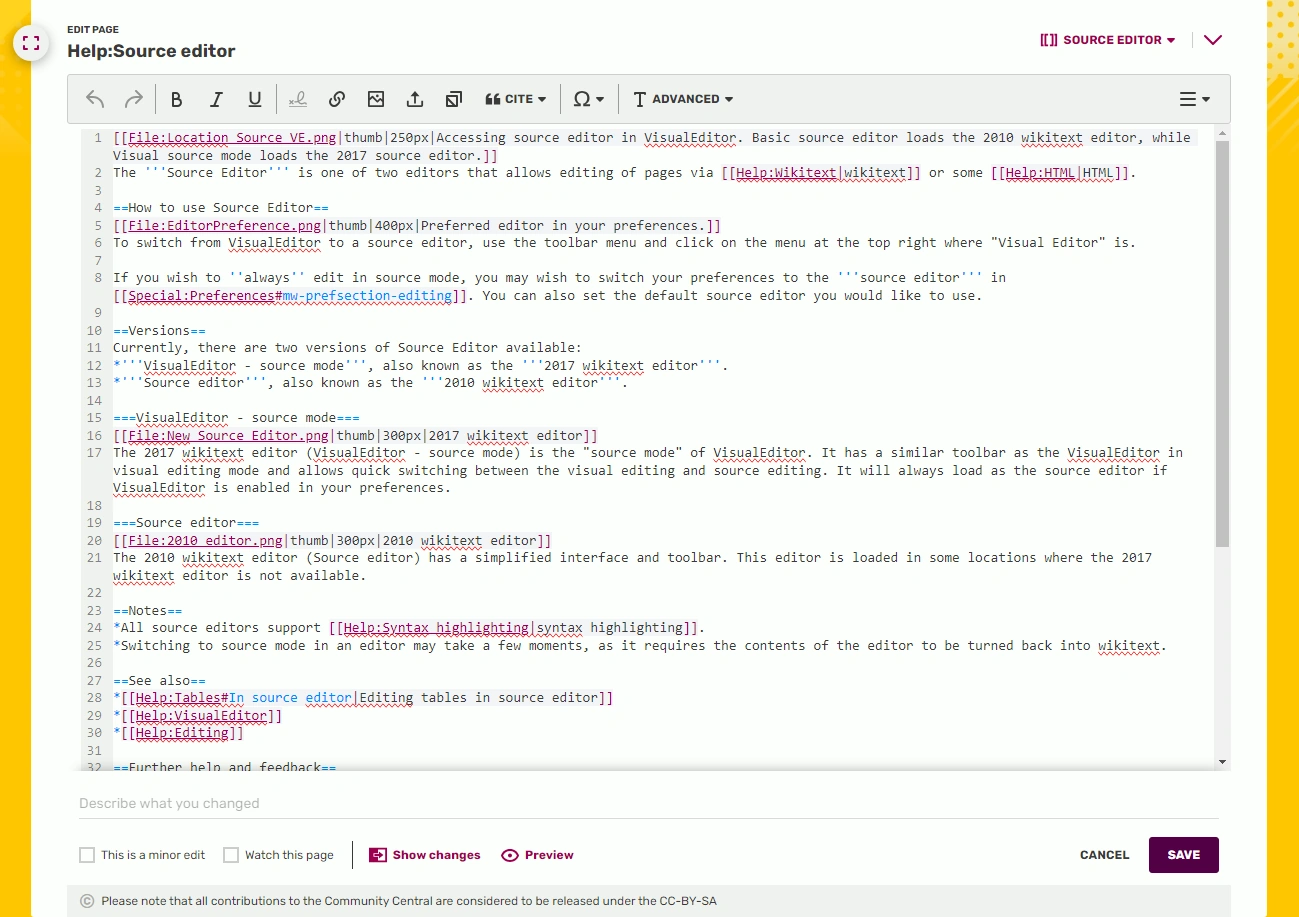 您可以在UCP wiki上使用新版MediaWiki視覺化編輯器、wiki語法原始碼編輯器或2010年版編輯器[1]。富文字編輯器、視覺化編輯器和原始碼編輯器不再可用。