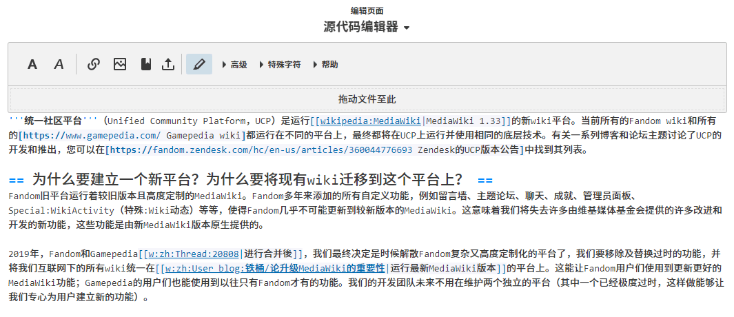 您將在UCP框架下的wiki獲得不同的編輯體驗:沒有側邊功能模塊、具有現代化的工具列和更寬更大的編輯區域。您還將看到,編輯頁面上不再具有連結至首頁的wiki標誌。