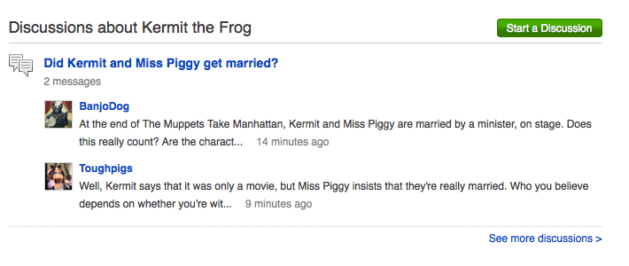 - 條目頁面底部的討論模組(Discussions module)是另一個方便找到已有論壇討論的方式,它會把與條目標題作為主題的活躍討論顯示在那裏。